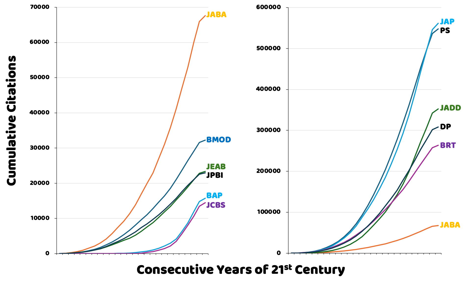 Left panel: Cumulative citation counts for 21st Century articles in 6 behavior analysis journals. Right panel: JABA compared to five well-known Psychology journals. Note the different ordinate scales in the two panels.